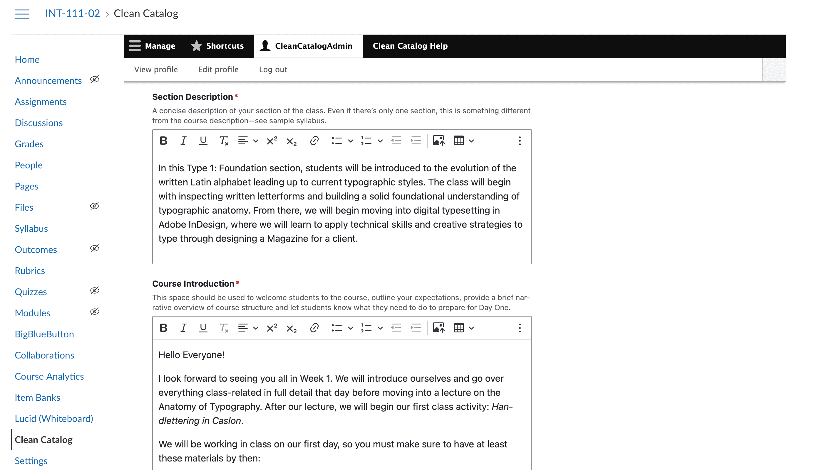 With this in mind, Clean Catalog can embed templated syllabi forms within Canvas, so that faculty can edit their syllabus information without leaving Canvas or logging into another system. Syllabi administrators can still log into Clean Catalog's software to take advantage of our features, but most faculty never have to leave Canvas to manage their syllabus.