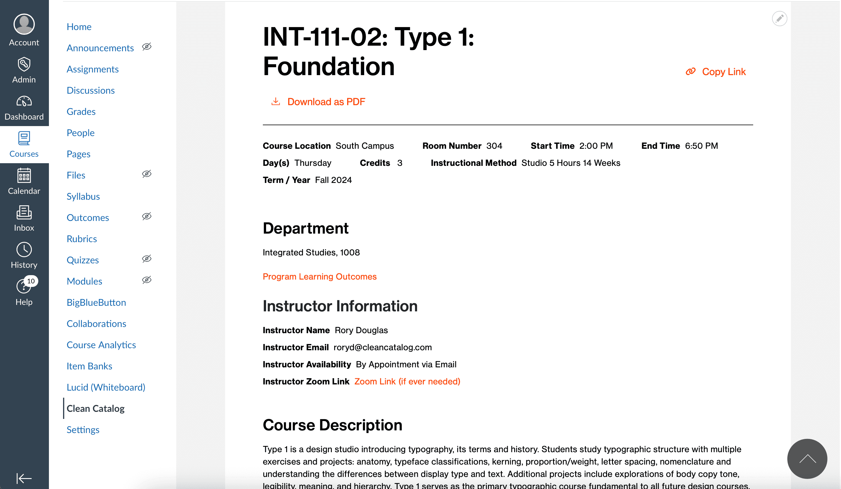 Similarly, Clean Catalog can embed finished syllabi so that students can see each course's syllabus without leaving Canvas. Students will still see syllabi in our custom templated designs, and can still download PDF versions of syllabi if you use that feature — but they don't have to learn to navigate or use a new system.
