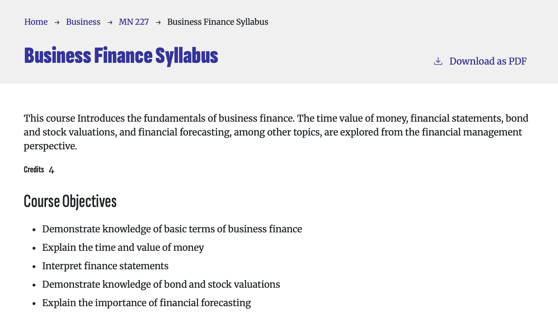 The Clean Catalog team also designed a fully custom PDF template for the downloadable version of each syllabus. Rather than relying on a generic export, the PDF mirrors the institution’s branding and layout standards, giving students a polished, print-ready document that feels cohesive with the rest of the site. The result is a connected, intuitive syllabi experience that supports both accessibility and institutional identity.