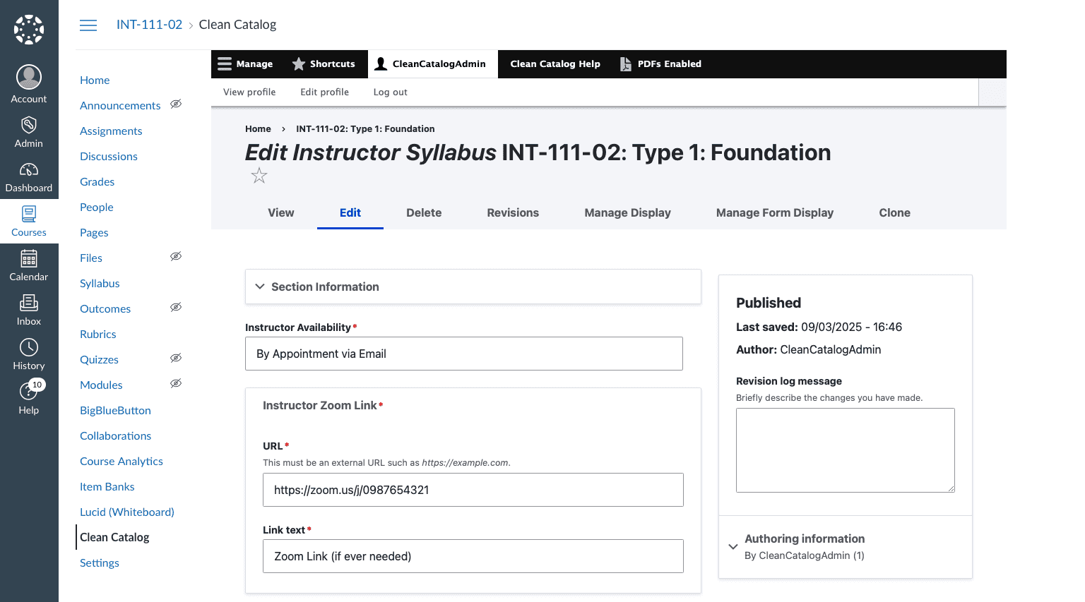 Clean Catalog’s solution was a fully embedded LTI integration inside Canvas. When instructors log into their courses within Canvas, they now see a Clean Catalog menu item that automatically generates a syllabus pre-populated with course details pulled directly from the Student Information System, such as course name, credits, schedule, and description. This eliminates repetitive data entry and ensures consistency across the board.